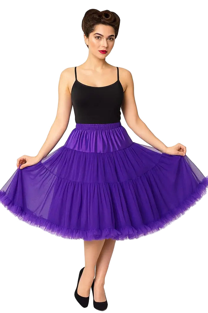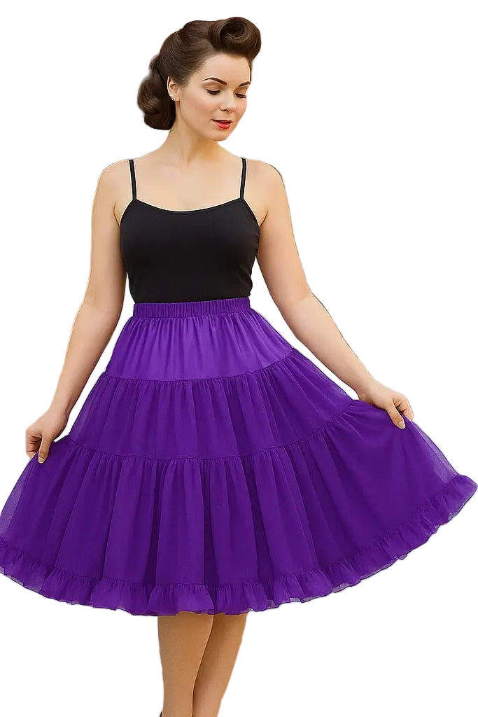 The Starlite design is a customer favourite because it's lightweight yet voluminous, making it ideal for layering under swing dresses or pairing with vintage-style separates. The purple colour adds mystical charm and sophisticated appeal, perfect for rockabilly festivals, 1950s weddings, or simply expressing your unique retro spirit. It's a wardrobe essential for anyone who loves fashion that's as enchanting as it is feminine.