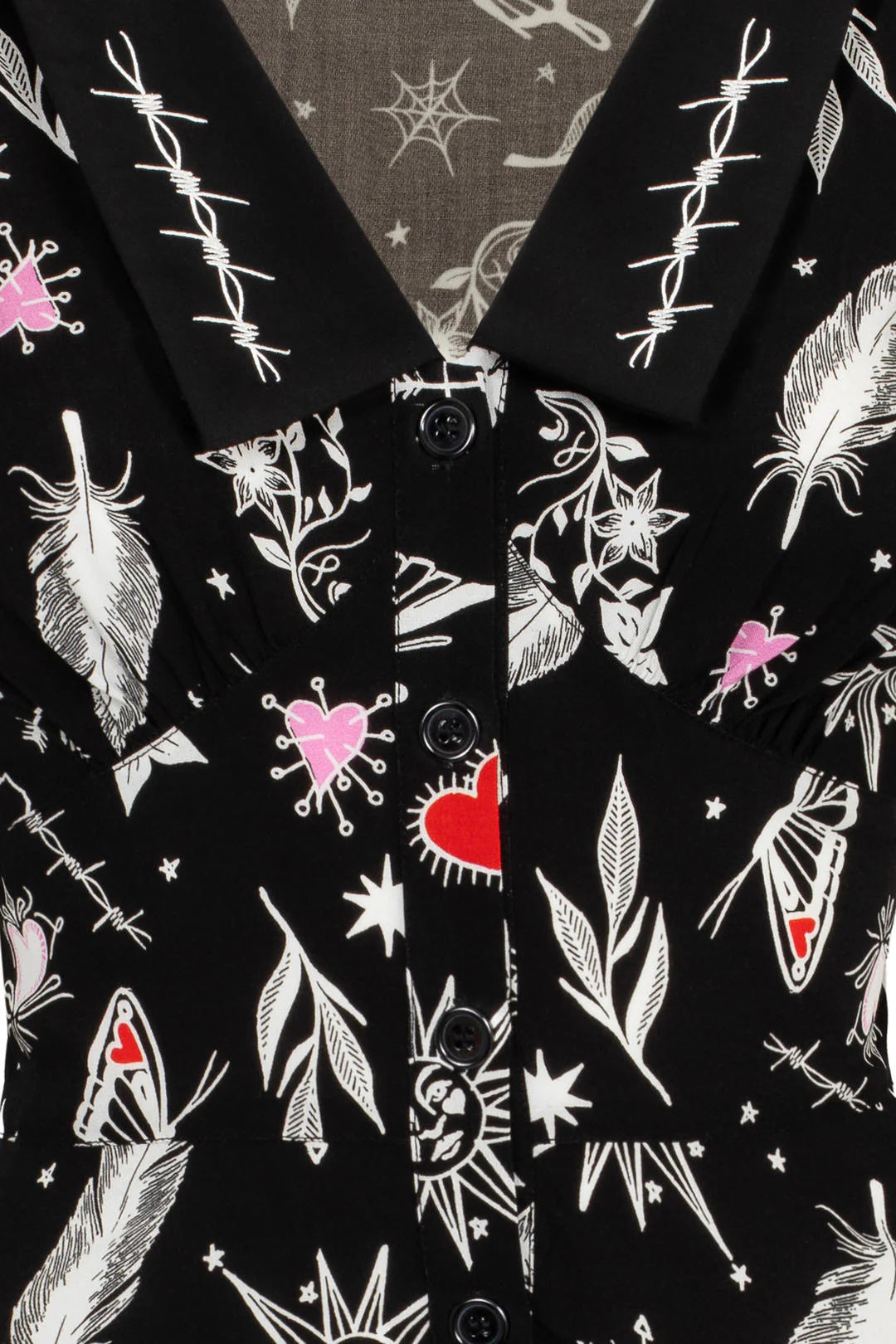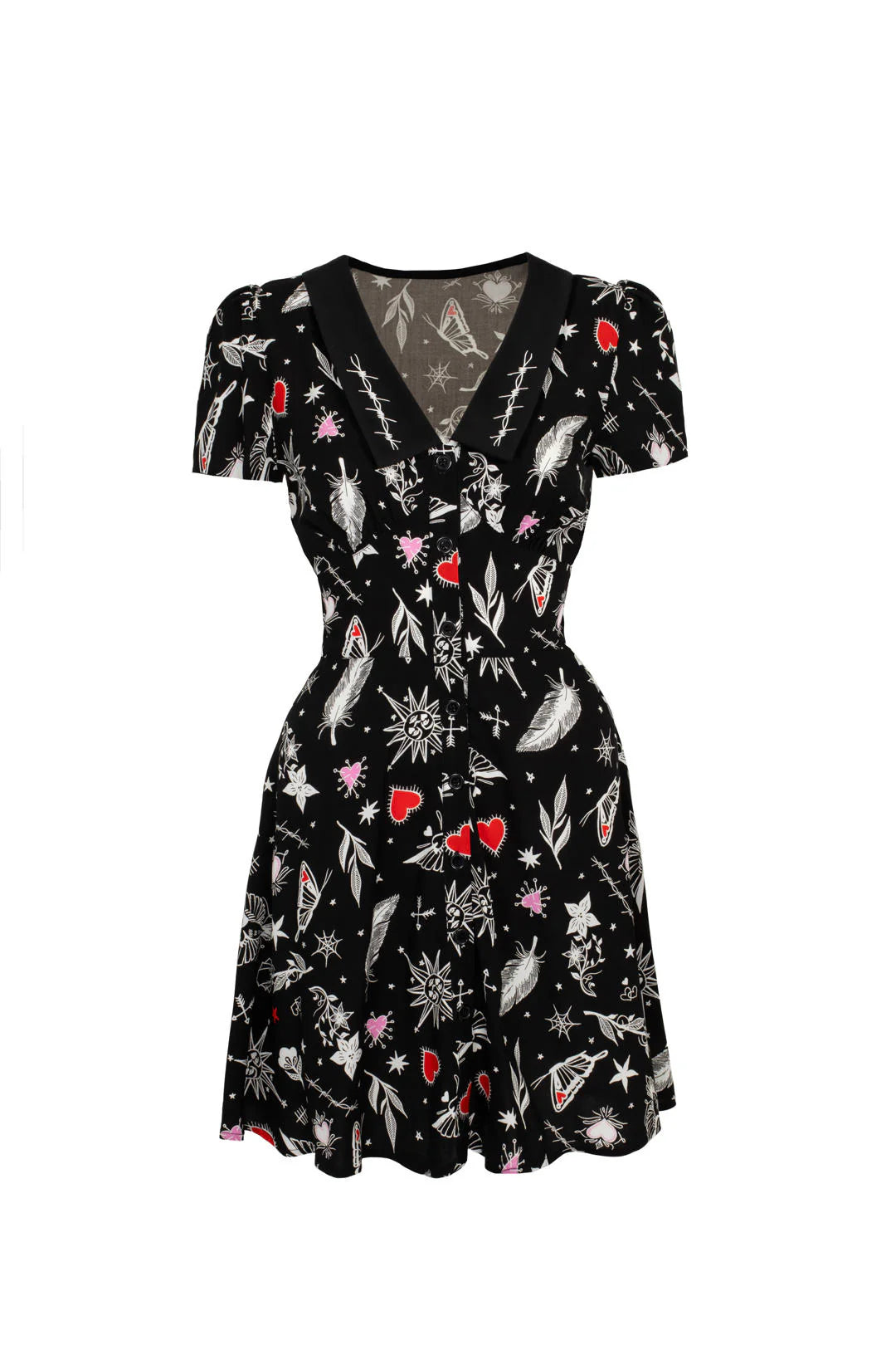Make a bold statement with the Leah Dress by Hell Bunny! This striking black mini dress is illustrated with eye-catching tattoo-inspired motifs that celebrate alternative culture and gothic aesthetics. The V-neckline features a bold black collar adorned with intricate barbed wire embroidery, creating an edgy focal point. The fitted underbust waist panel beautifully accentuates your silhouette before flowing into a flared skirt that's perfect for movement and style.