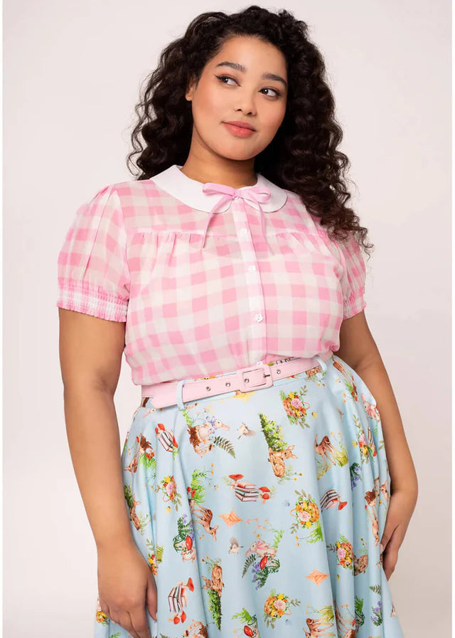 Step into sweet vintage charm with the Cindy Top by Hell Bunny—a delightful 1950s inspired piece. Features pink & white gingham check, semi-transparent chiffon, white rounded collar with pink bow tie, puff sleeves, and button front. Semi-fitted with princess seams. XS-4XL. Order now for fast delivery!